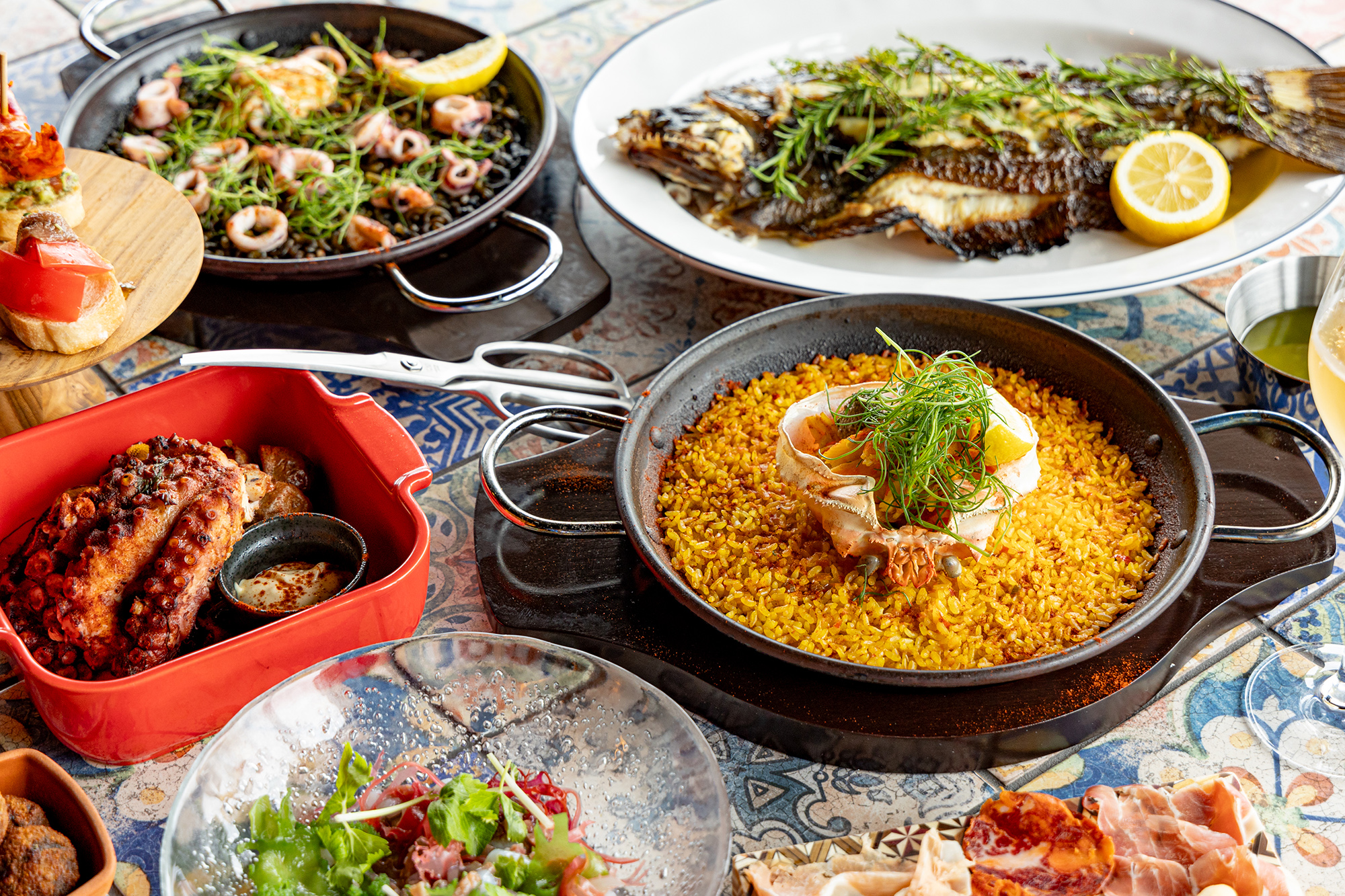 タコのガリシア風やパエージャなどのクラシックなメニューをベースに、遊び心あふれる一皿も揃えました。魚介の持つ旨味と香りを最大限に引き出した料理をお楽しみいただけます。